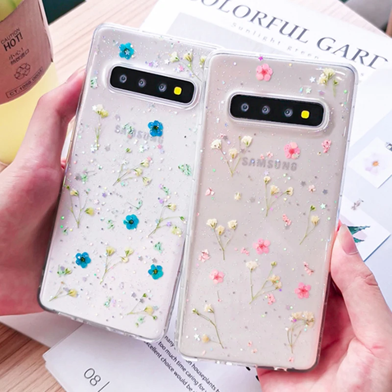 Sale Transparent Shining Glitter Dried Flower Phone Case For Samsung Galaxy S10 S9 Plus Fashion Real Flo Best Offer only pay US $2.45